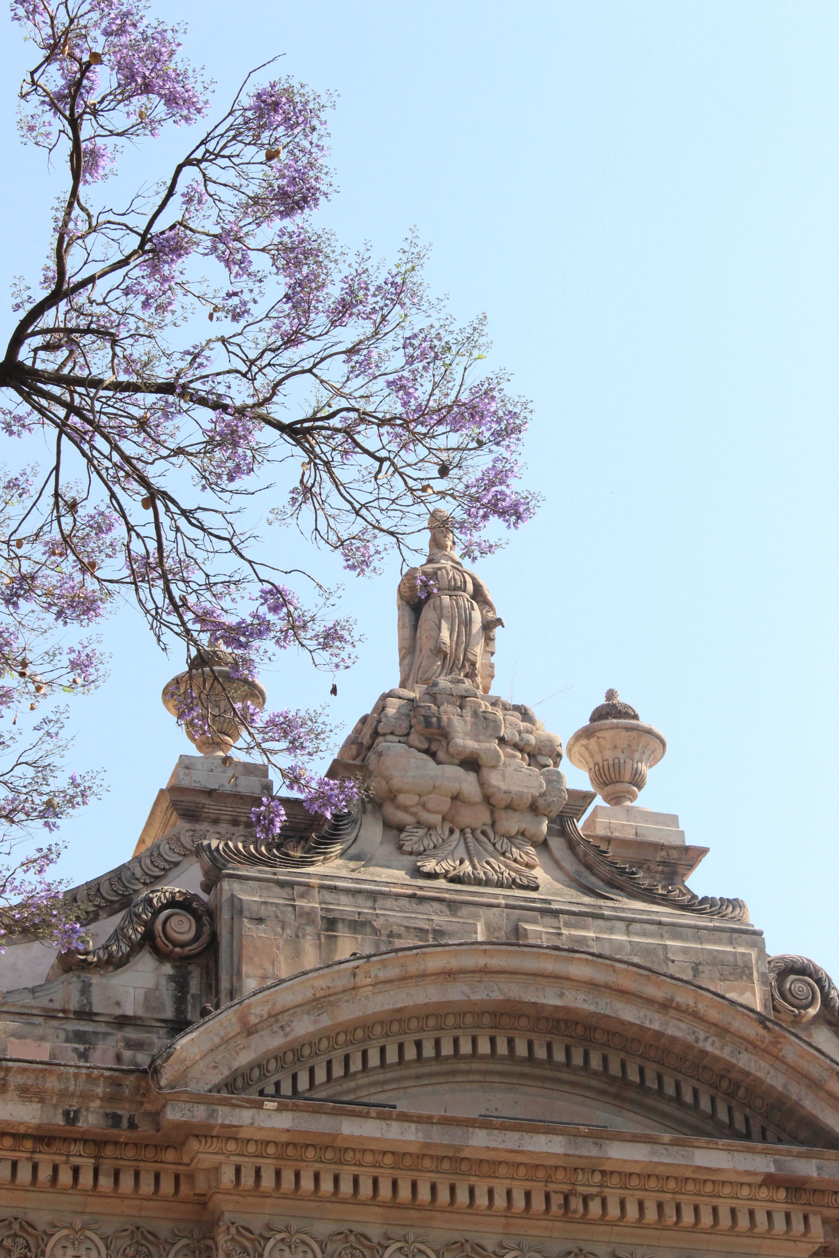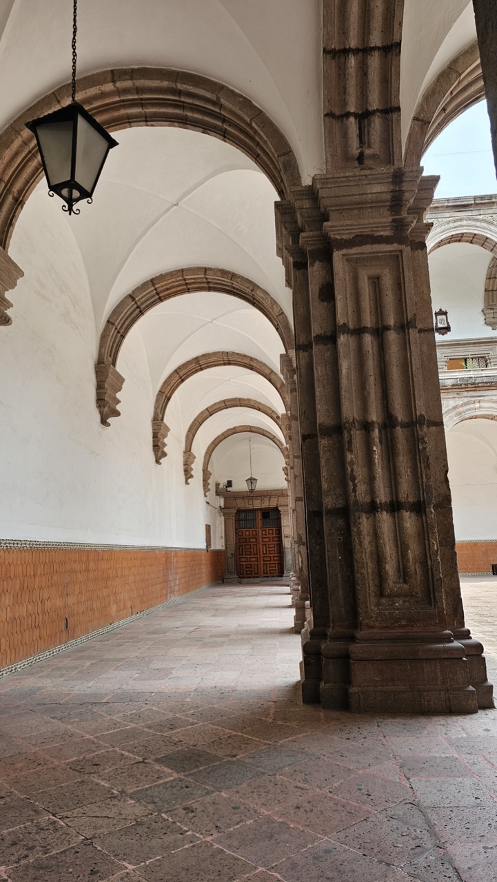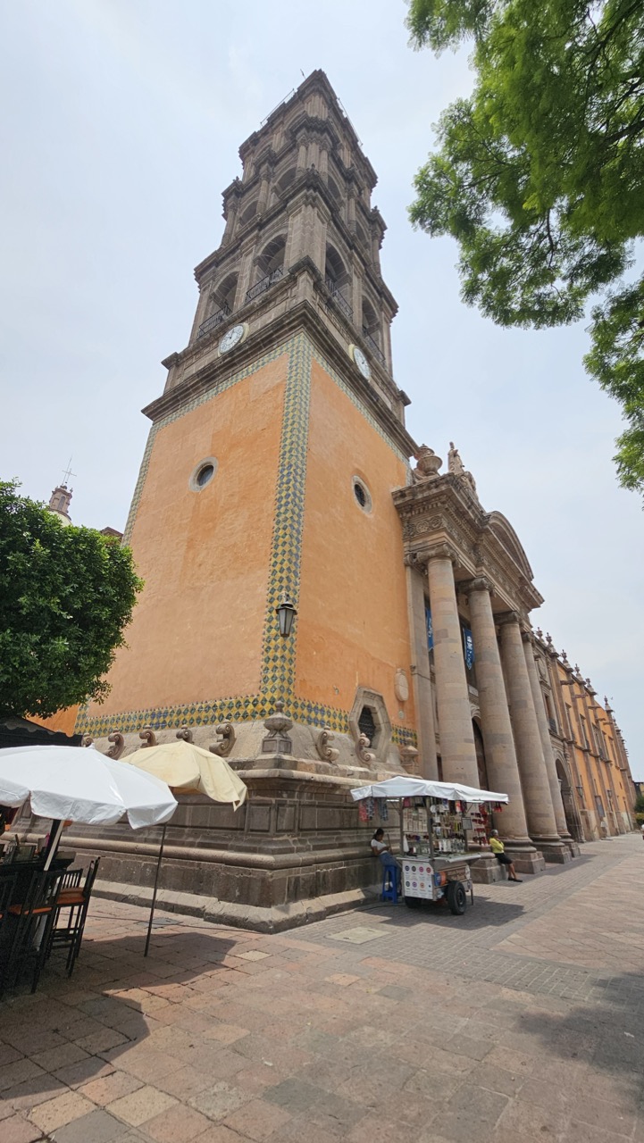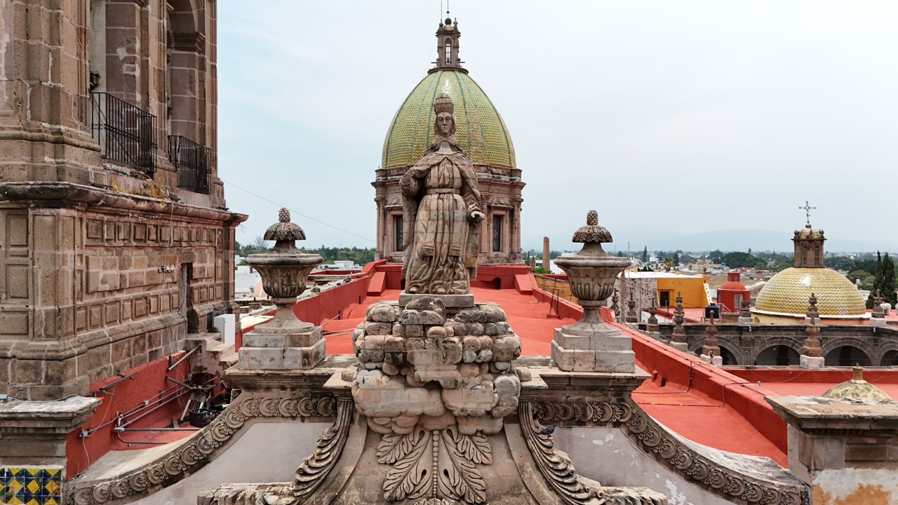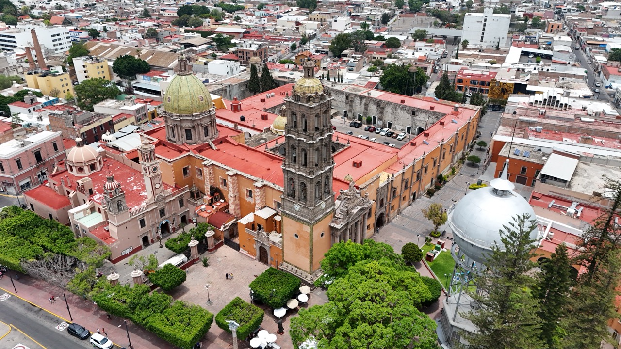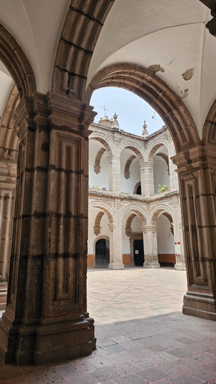 C Construction began in the 16th century, and its majestic Baroque tower, as well as the arches inside the cloister, were completed in the 18th century. The interior altars were redesigned by Tresguerras in the 19th century, establishing his neoclassical architectural style.